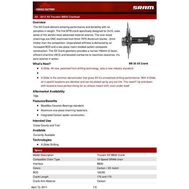 Sram FC XX 170 Q164 42-28 BB30 FC XX Q164 BB30 2.2 170 2842 No BB N
